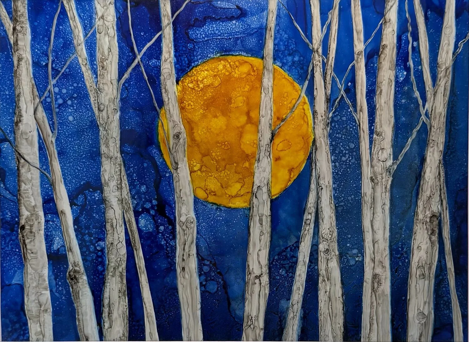 Artwork Description: I am somewhat obsessed by the moon and find it a central part of many of my works. This alcohol ink landscape was inspired by the background which was done first. The trees were done last. EMAIL: bsclark3@aol.com