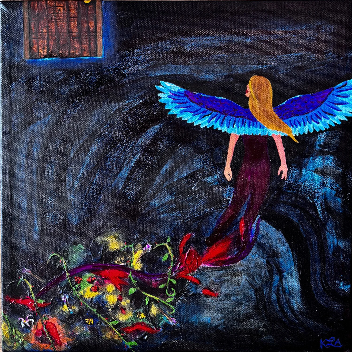 Artwork Description: This is a very personal piece that I painted in commemoration of my decision to dedicate myself to creating artwork and sharing it with the world. To stop listening to the well-meaning voices around me and instead follow my own light into the unknown.