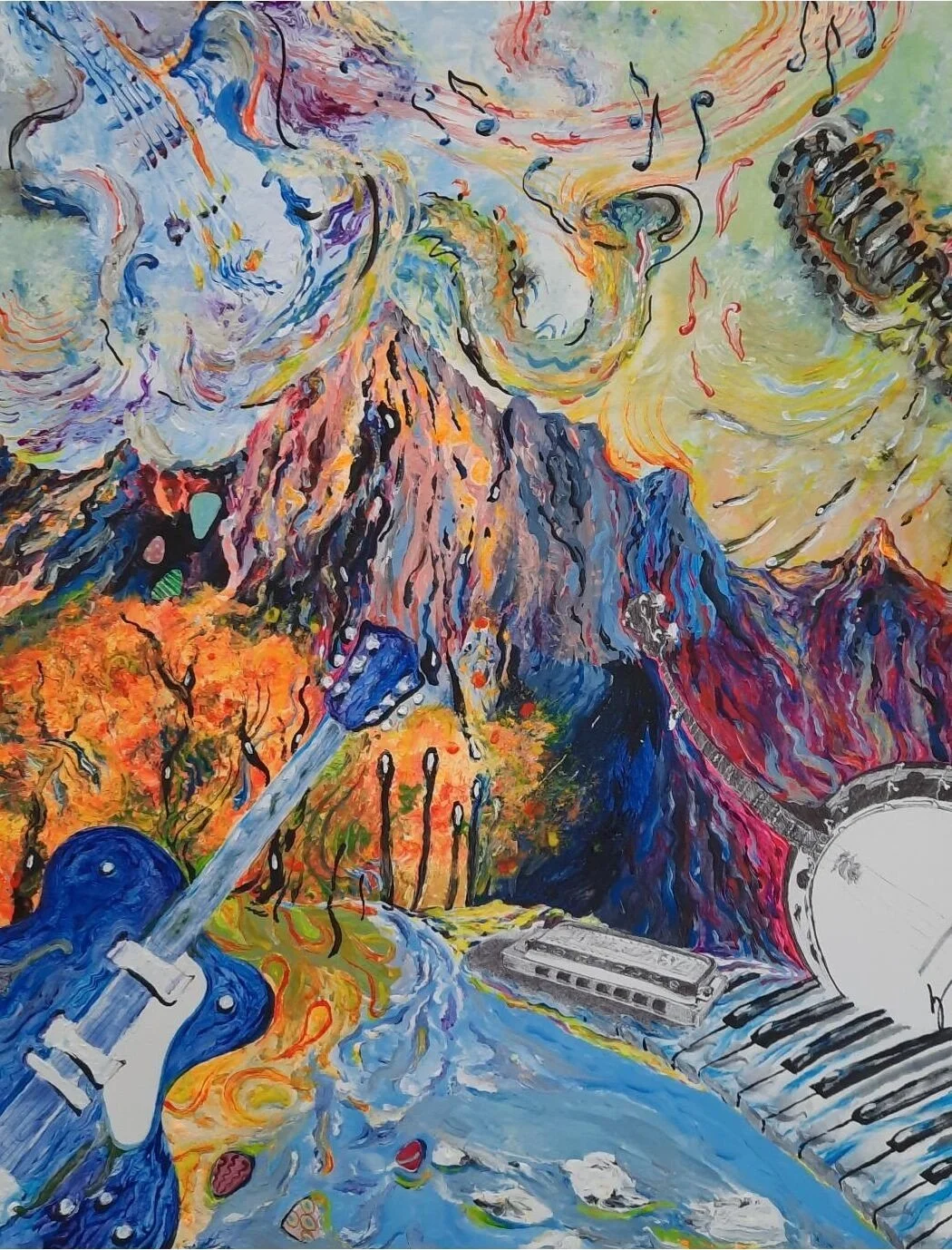 Artwork Description: Depicting musical creativity, these Blues pieces give rhythmic meaning and dialogue to the echoing canyons. Memories and tales are often heard only through these musical storytellers, recanting happiness, sorrow and rites of passage. EMAIL: mariellenlopez@yahoo.com
