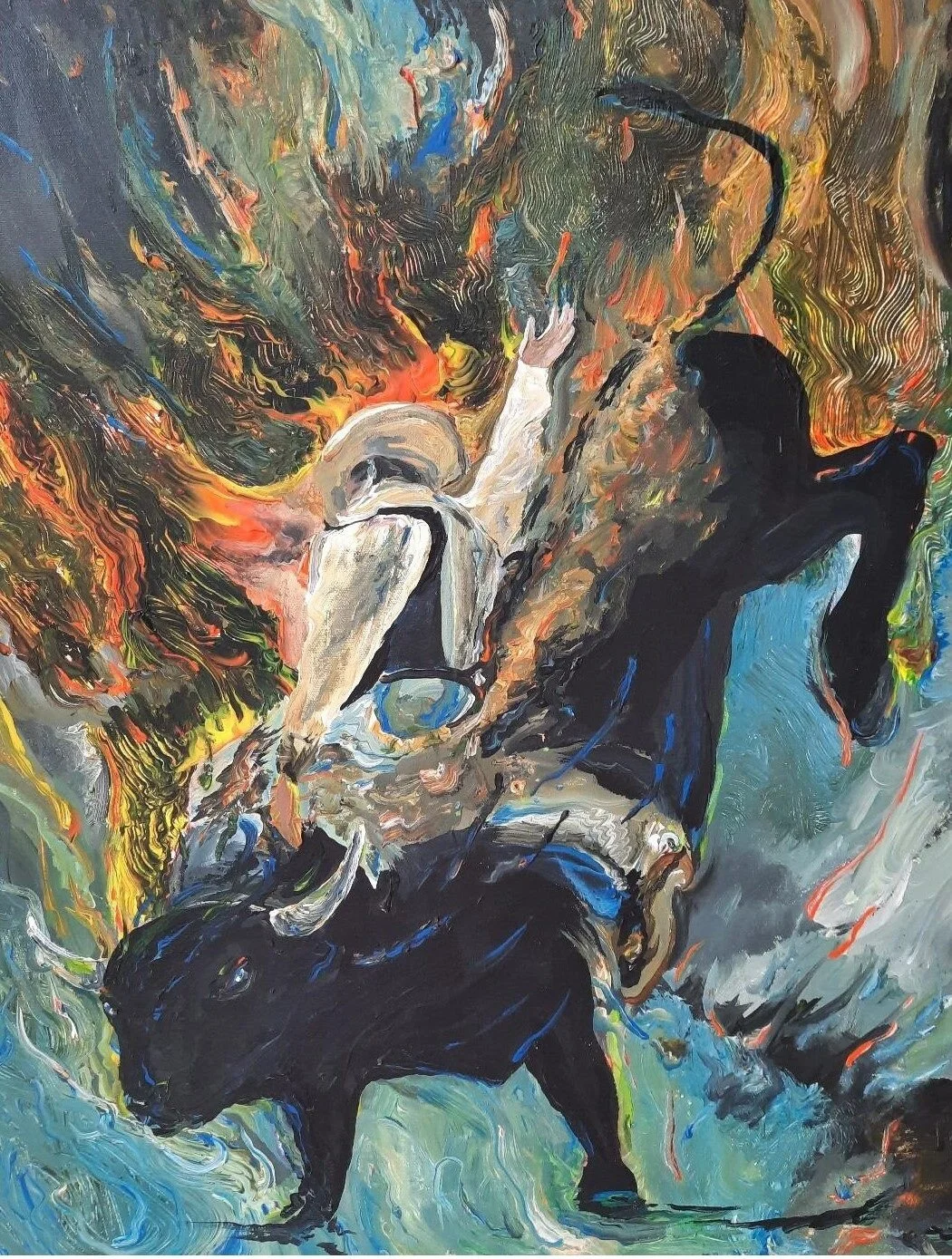 Artwork Description: In tribute to the brave risktakers who mount the demon and face head-on into the hell fire. Helldorado- Yee haw! EMAIL: mariellenlopez@yahoo.com
