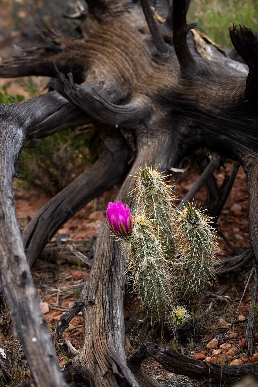 Artwork Description: The beautiful photograph of an emerging magenta bloom of a Hedgehog Cactus illuminates the burned and fallen tree from a long ago forest fire. Nature's ability to foster a Fresh Start from ashes is a testament to her resiliency. EMAIL: tuknapp@gmail.com