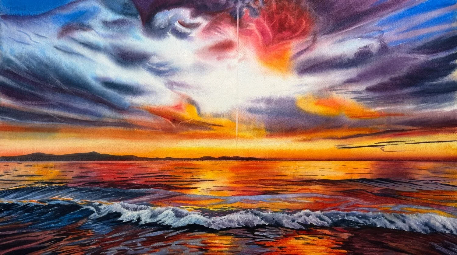 Artwork Description: This original watercolor painting utilizes vibrant, bold pigments and wet-on-wet techniques to capture the dramatic interplay of light and shadow in the sky. I used lifting methods to create the striking vertical ray of light piercing through the heavy clouds and reflecting on the ocean waves. I chose "Radiant Pillar" for the "Fresh Start" theme because it perfectly embodies a moment of breakthrough. The intense light conquering the darkness symbolizes hope, clarity, and the powerful dawn of a new day after a period of storm or uncertainty. It serves as a strong, guiding light for a brand-new journey.