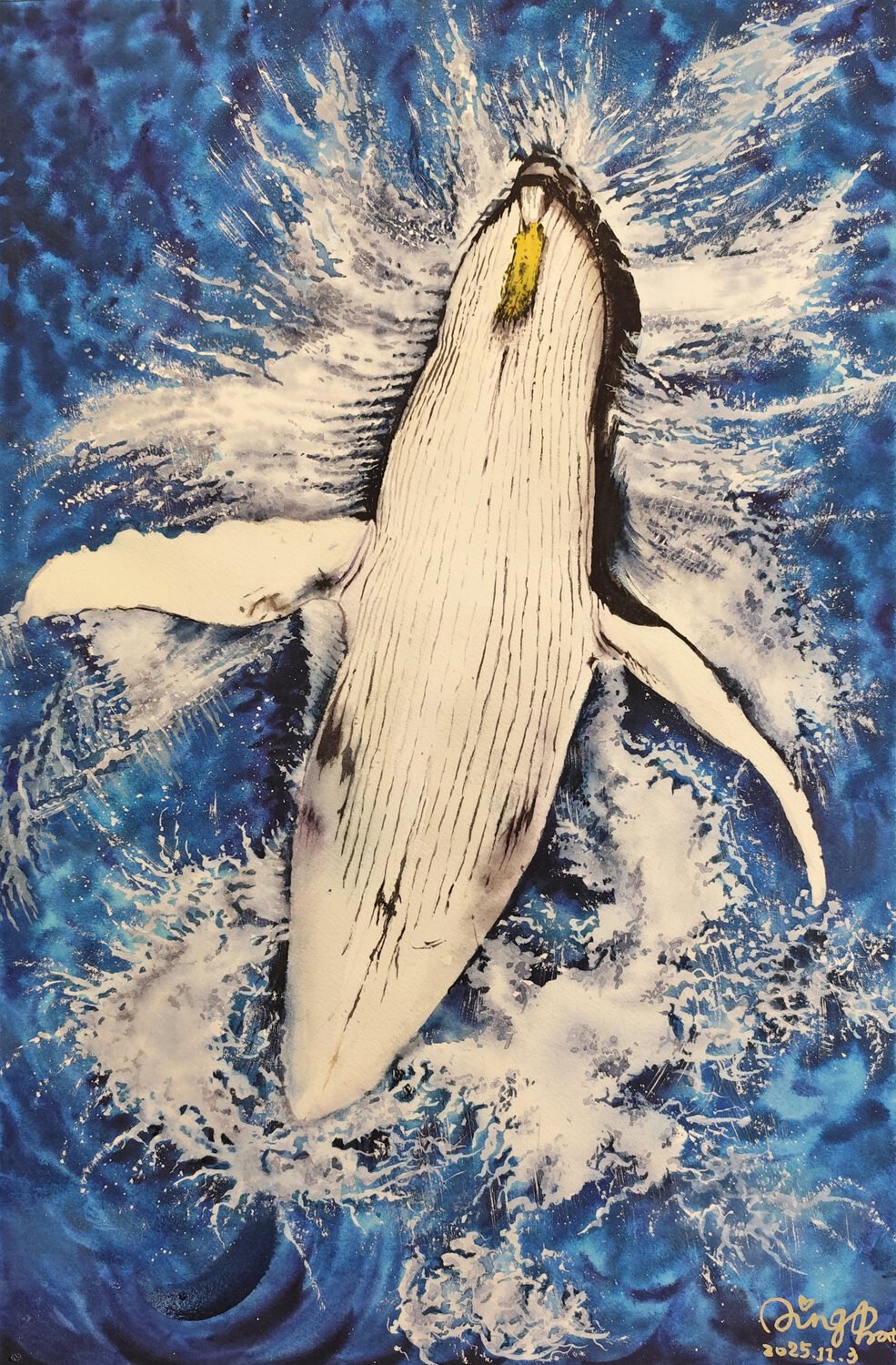 Artwork Description: This piece was created using watercolor on paper. I utilized wet-on-wet techniques to capture the deep, fluid essence of the ocean, combined with dynamic splattering and lifting methods to depict the explosive sea spray. For the "Fresh Start" theme, a humpback whale dramatically breaching the water's surface serves as the perfect metaphor. It represents breaking through the heavy depths of the past, emerging into the light, and taking a powerful first breath of new air. This artwork embodies the surging energy, freedom, and sheer force of embarking on a brand-new journey.