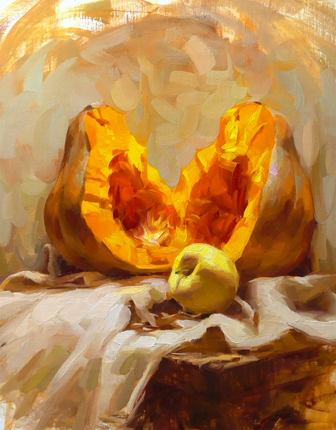 Artwork Description: I painted this still life with the idea of emulating the warmth and glow of light while utilizing the still life as a vehicle in order to project that effect.